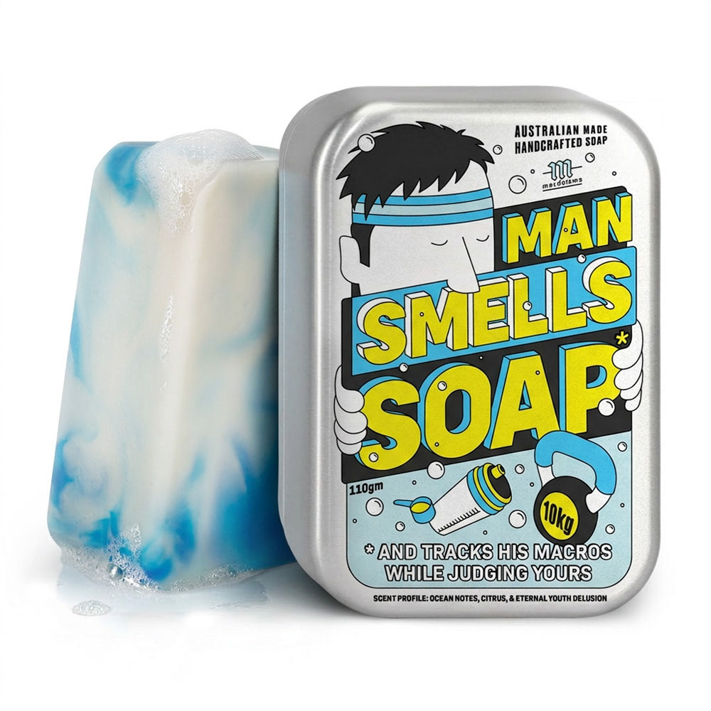 In essence, Man Smells Soap is a satirical soaps line from Mardoisms featuring familiar male archetypes - the DIY Guy, the Budget Guy, and the Sporty Guy - each immortalised in a handcrafted goat milk soap with its own scent profile and mildly questionable life philosophy. From ocean notes and citrus-fuelled gym enthusiasm to cool spearmint fiscal vigilance and cinnamon-scented DIY ambition, every bar delivers rich lather with a generous dose of observational humour.